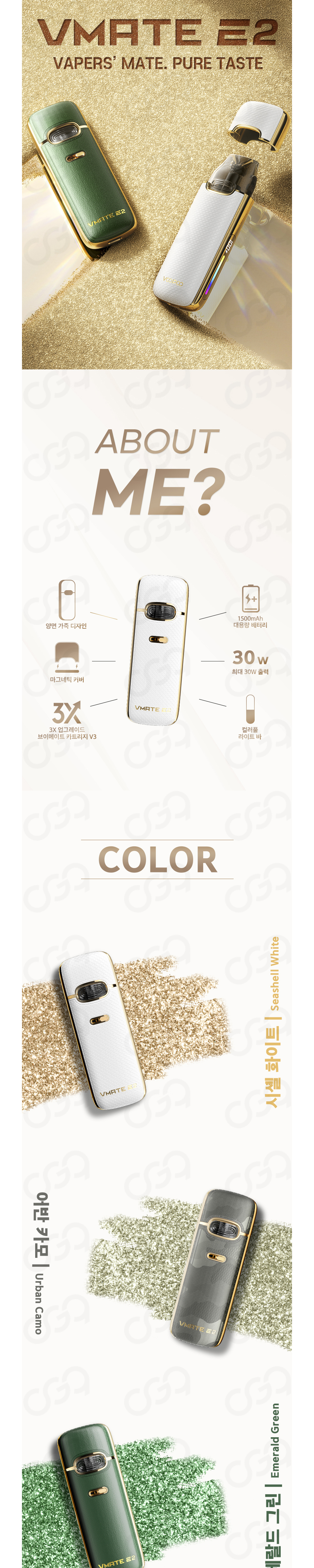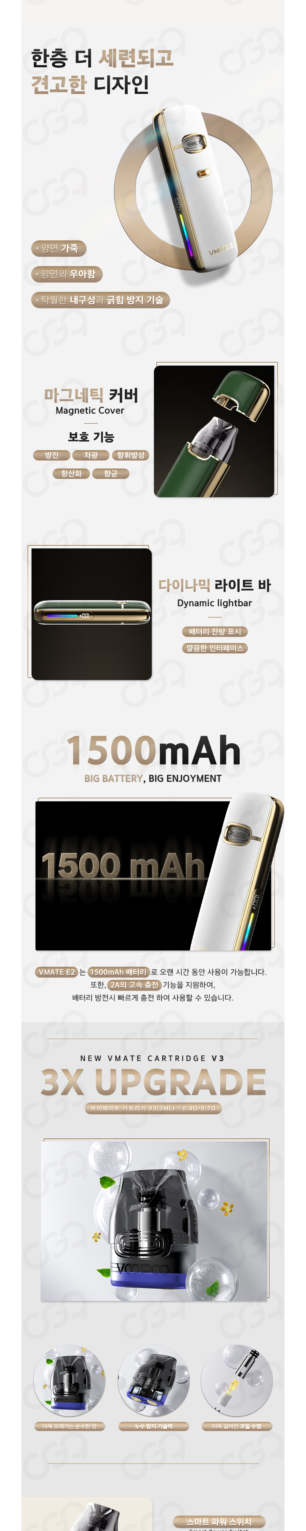 기존의 브이메이트 E 킷과 같이 자동흡입 제품이며, 라이트바와 배터리잔량을 디스플레이로 보여주는 제품입니다.
