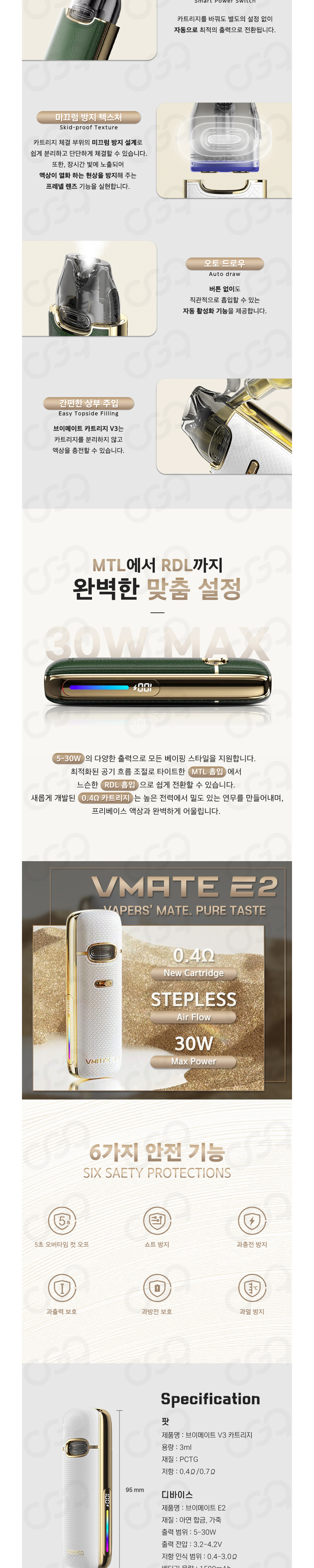 3ml 용량의 카트리지로 0.4Ω, 0.7Ω, 1.0Ω 세 종류로 출시되었으며, 입호흡기준 1.0Ω 카트리지를 추천드립니다.